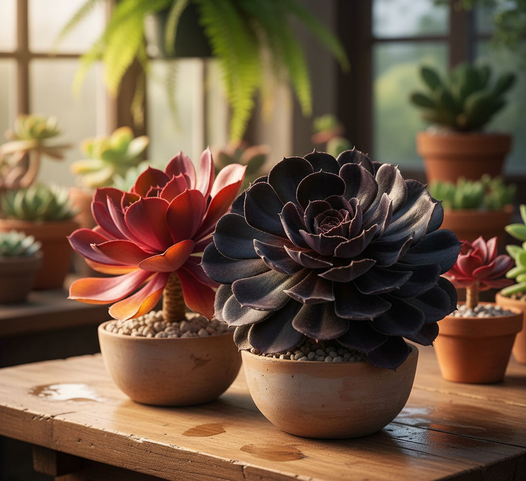 Echeveria Black Diamond, siyaha yakın mor yapraklarıyla dikkat çeken nadir bir sukulenttir. Bol ışık, az su ve iyi drenajlı toprakta rengini derinleştirir.